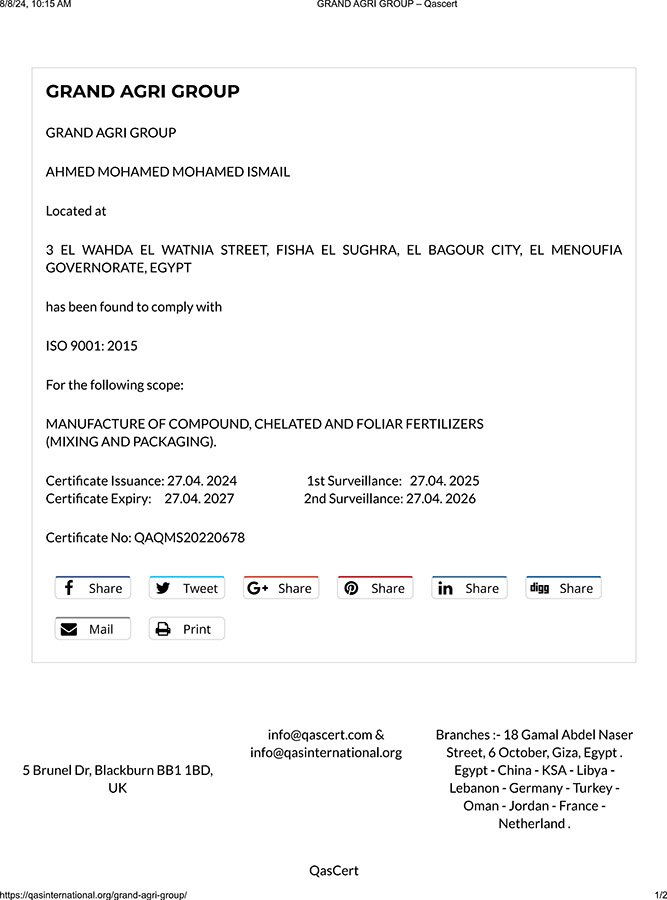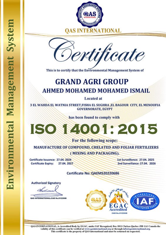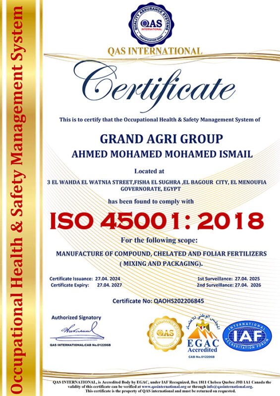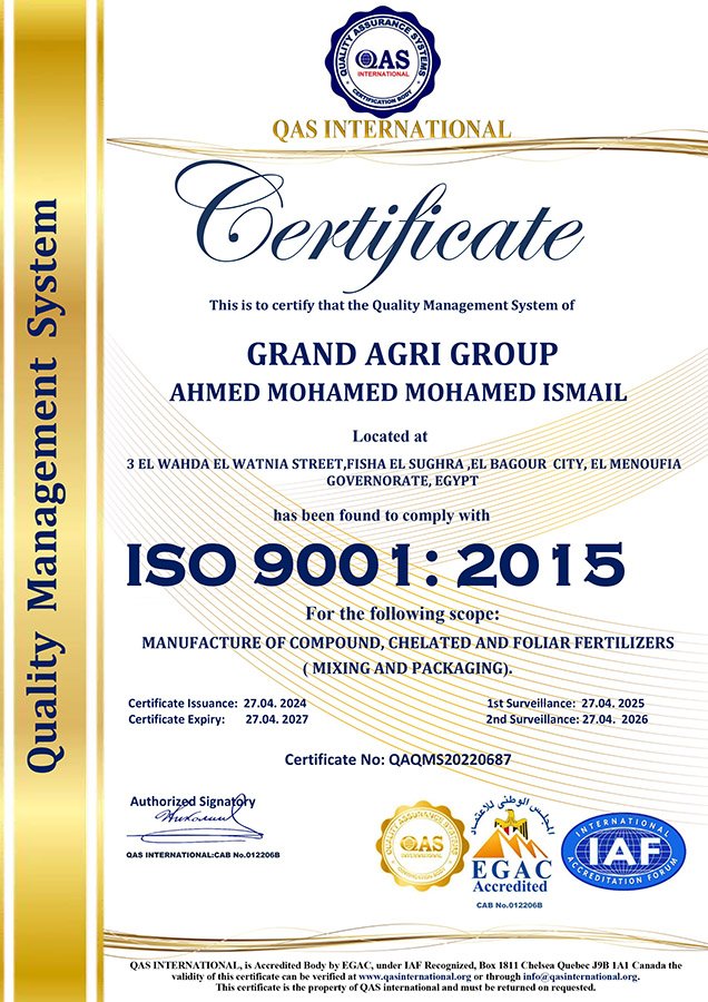 شركة "جراند أجري جروب" هي شركة متخصصة في القطاع الزراعي، وقد حققت مكانة مرموقة في هذا المجال بفضل التزامها بالجودة العالية والمعايير الدولية. الشركة حاصلة على العديد من شهادات الاعتماد ISO، مما يعكس التزامها بالممارسات المستدامة وإدارة الجودة والبيئة. من بين الشهادات التي حصلت عليها: